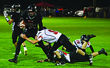 River View running back Tanner Brown (2) finds himself in a whole lot of trouble …
