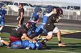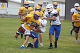 A Soap Lake defender takes down a Wellpinit running back during Friday’s jamboree.