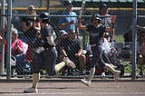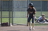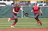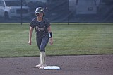 Broncos senior Megan Melcher, left, runs toward the infield to catch the ball hit by …