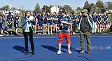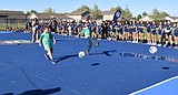 Youth soccer players Kameron, left, and Abel kick the ceremonial first goal at the opening …