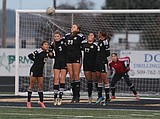 The Knights form a wall to block a shot attempt from an Omak player. Head …