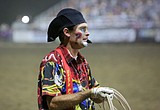 Rodeo clown J.W. Winklepleck watches competitors as he makes his way around the sidelines of …