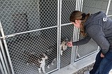 Quincy Animal Shelter Manager Jessica Kiehn greets a pair of puppies in one of the …