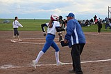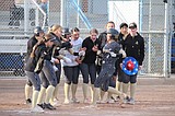 The Royal softball team gathers as JIll Allred (6) crosses home plate after her solo …