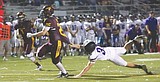 A Huskies football player runs through traffic during a game against Toppenish last season.