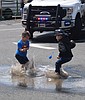 Jax, left and Beau, right, jump in puddles during the Touch a Truck event Saturday. …
