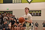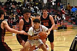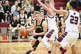 Luke Bergeson (2) of Royal High School drives for the basket against Andrew Yorgesen (32) …