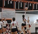 The Huskies’ Whitlee Hollenbeck (2) awaits the Tigers next serve. Head Coach Steve Parris said …