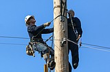 Grant PUD journeyman lineman Carson Fisk, at the top of a power pole, navigated getting …