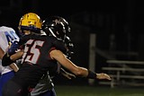 Ian McWalter (55) pushes through the Wellpinit offensive line to get after the quarterback. Head …