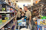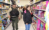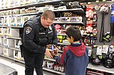 Robbie Rowe/The Sun Tribune - A little girl and her accompanying officer buddy shop the …