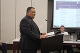 Othello City Council member Angel Garza discusses the choices available at Monday’s meeting.