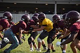 The Maverick offensive and defensive lines crash toward each other during a Moses Lake practice …
