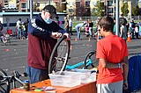 A volunteer demonstrates some maintenance for a bike owner. The 2023 bike rodeo, sponsored by …