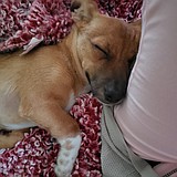 “Baby,” a dog rescued by Lost and Found Pets of Grant County, snuggles while she …