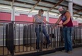 Samantha Rodeback and Rhody Raymond try to entice the sheep to stay inside the pen …