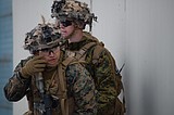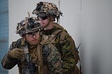 Marine Corps Lance Cpl. Ezekiel Parades (front) and Cpl. Will Skiles peer around a building …