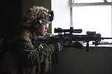 Marine Corps Lance Cpl. Mason Noe holds a firing position after helping to secure a …