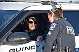Quincy Police Sgt. Jorge Trujillo talks briefly with Sgt. Julie Fuller prior to driving the …