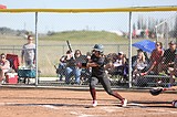 Moses Lake senior Ali Stanley starts to run to first base after making contact with …