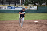 ACH junior Everett Wood runs to first base after making contact with a pitch against …