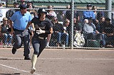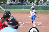 Royal junior Lily Delarosa dashes to first base after making contact with a pitch against …