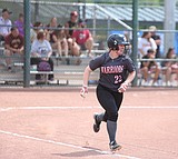 ACH junior Shaina Beal runs to first base after making contact with a pitch against …