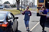 Marilyn Stewart, left, and Corie Otto, center, hand a bundle of meals to a man …