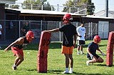The Mavericks football team huddles up before a break at their first practice of the …