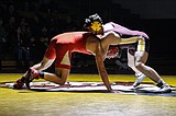 Moses Lake’s Everett Ashley, right, looks to maintain control of Eastmont’s Luke Harrison in their …