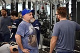 Evolve Fitness clients Dan Bishop and Brandon Nicholas talk between sessions on Saturday.