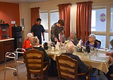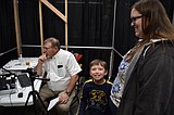 Anthony Alumbaugh grins as his mom Cassie Alumbaugh, right, waits for Craig Johnson to finish …