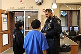 Othello Police Officer Tyson Cox, right, talks with students who got new shoes as part …