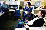 David Cole, a Coeur d'Alene Press reporter, waits for Tak Nomura, center, and Michihiro Hanamura …