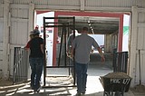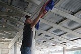 Bob Paxman (left) and Viktor Pashkovsky remove protective plastic from a new lighting system being …