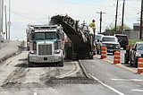 A milling machine removes the asphalt in the left turn lane at the intersection of …