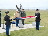 Staff Sgt. Andrea Wysock and Pfc. Marco Cerda fold a flag at a memorial service …