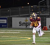 Mavs player Dametree Hindman sprints down the open field with the football to make a …