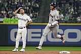 Astros shortstop Jeremy Peña rounds the bases after hitting a solo home run in the …