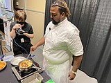 Chef RJ Harvey, culinary director for Potatoes USA, stirs a pot of broth, potatoes and …