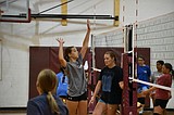 A camper at the Lil Mav volleyball camp rises for a spike during a drill. …