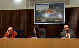 Council member Mark Fancher, Deputy Mayor Deanna Martinez and Mayor Don Myers listen to staff …