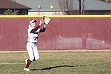 Moses Lake’s Kendall Reffett collects a fly ball to the outfield in a March game …