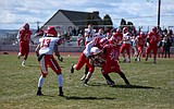 Ethan Medina (40) combines with a teammate to tackle a Clarkston High School player in …