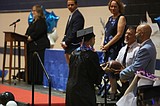 Soap Lake’s Christian Foster (left) runs up to the side of the graduation stage to …