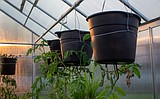 Upside-down hanging tomato plants are one of the first additions to the new greenhouse for …