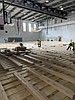 Construction workers install the floor in the new Almira school gym. The new building replaces …