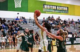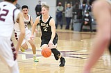 Luke Bergeson (2) of Royal High School drives the lane during the Friday game with …