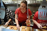 Amy Dana, United States of America Mrs. Washington 2022, spoons jam onto bread as part …