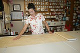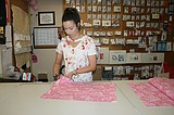 Heather McDowall smooths fabric before cutting it for a customer at Country Fabrics, Moses Lake. …
